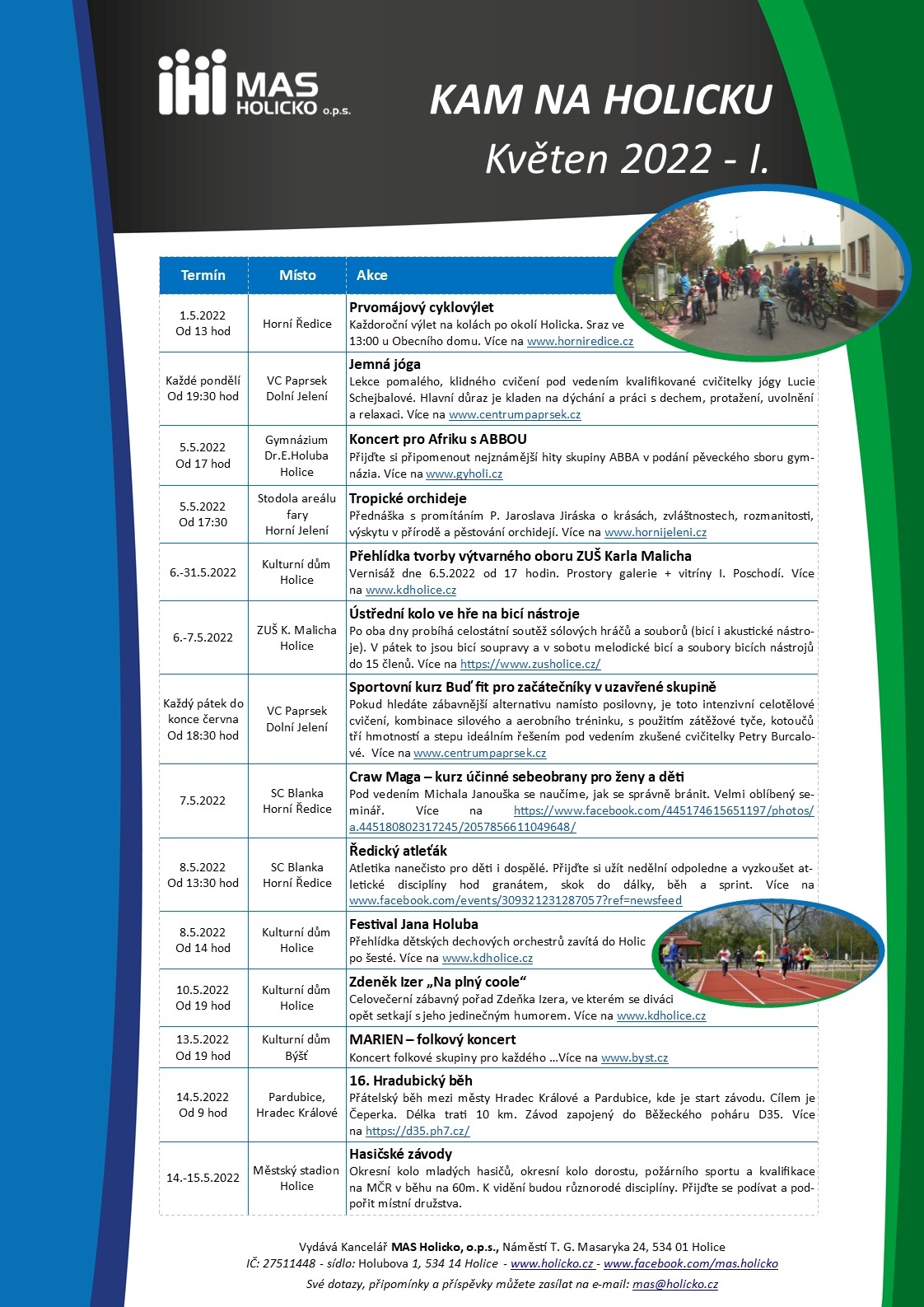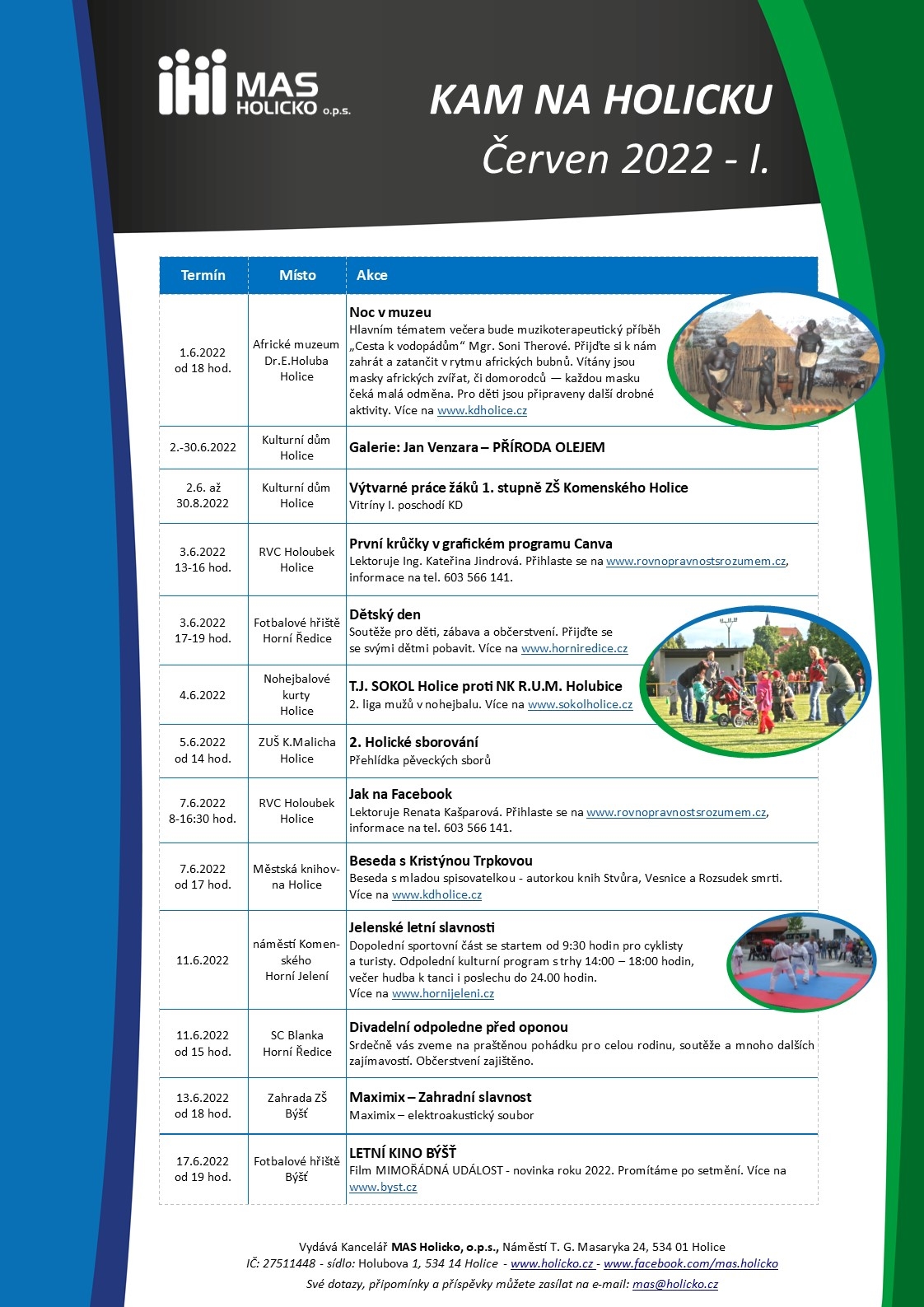 V příloze je kalendář plánovaných akcí, které se budou konat v červnu 2022 na území MAS Holicko...