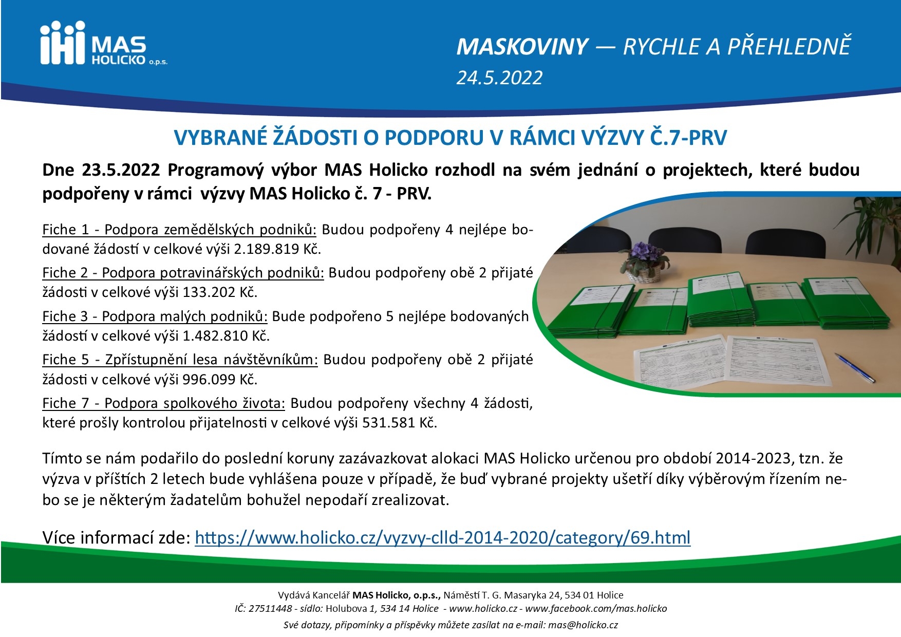 Dne 23.5.2022 Programový výbor MAS Holicko rozhodl na svém jednání o projektech, které budou podpořeny v rámci výzvy MAS Holicko č. 7 - PRV.