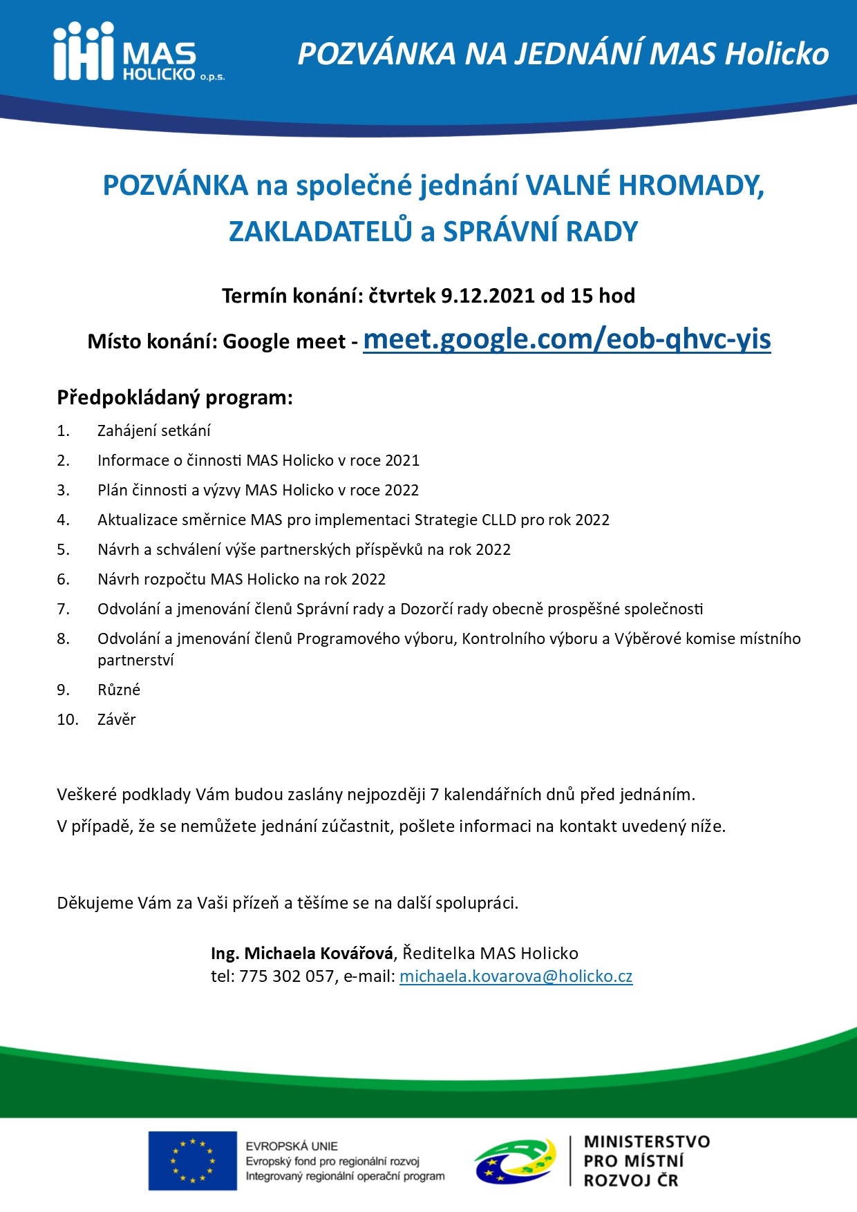 Tímto si Vás dovoluji pozvat na jednání Valné hromady MAS Holicko, které se uskuteční ve středu 9.12.2020 od 15:00 hodin.