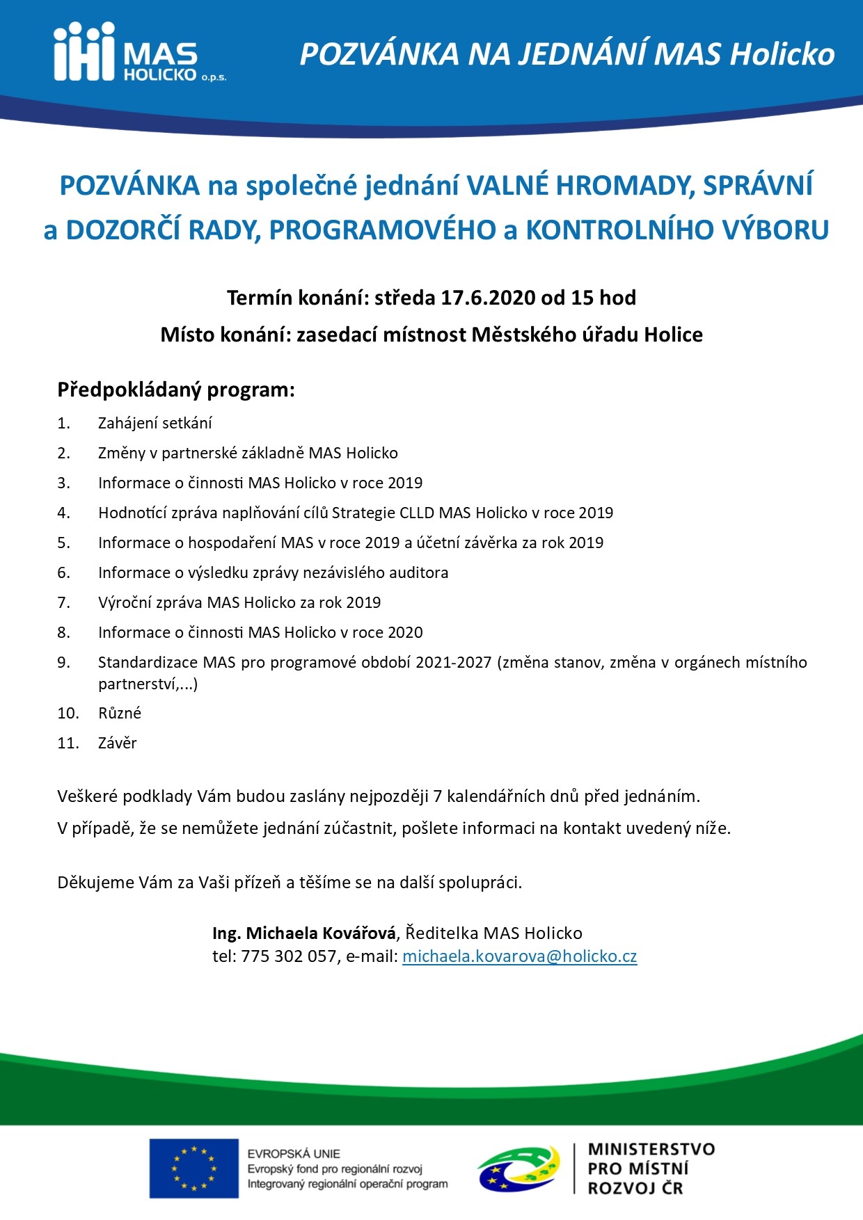 Tímto si Vás dovoluji pozvat na jednání Valné hromady MAS Holicko, které se koná ve středu 17.6.2020 od 15:00 hodin v zasedací místnosti...